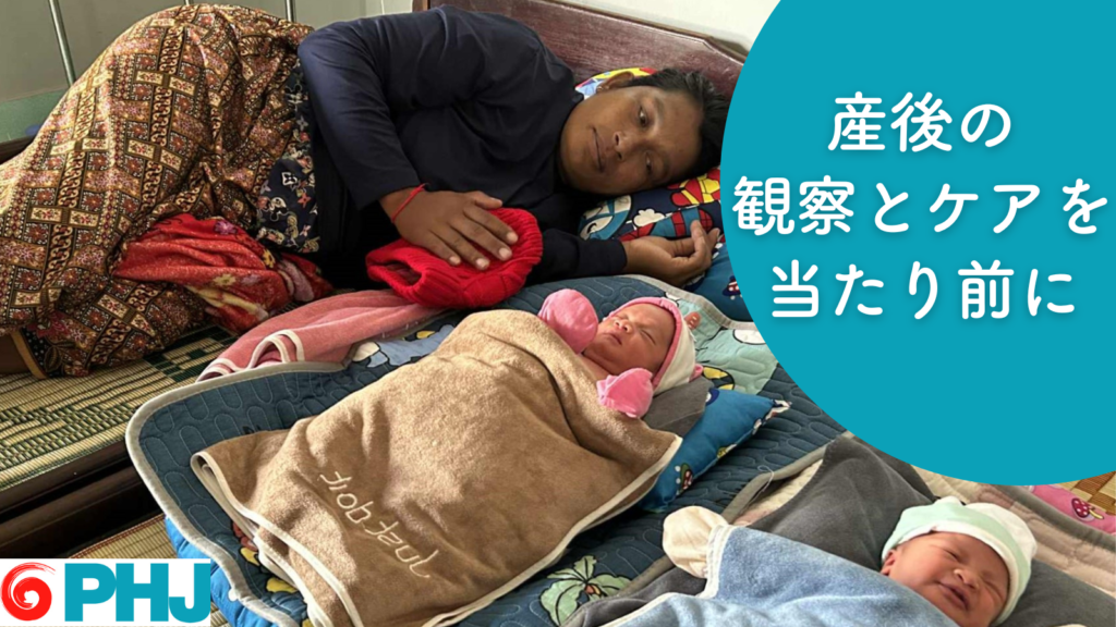 出産直後から産後数日間、特に最初の24時間は突然の大量出血によって命を落とすリスクが最も高い時期になります。カンボジアでは、1970年代の内戦とポル・ポト政権により、医療制度は一度完全に崩壊した歴史があり、母子保健は脆弱な状況です。特にPHJの事業地シェムリアップ州ソトニクム保健行政区では保健センター(医療施設)で出産しても早い段階で自宅に戻ってしまうこともあるため、産後の観察やケアが十分とはいえない現状です。